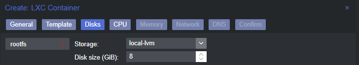 This container need a disk, so let's create one. Usually LXC SO images requieres something around 1.5GB. In my case with the default 8GB will be more than I'll probably ever need. Also, pick the storage source, if we have more than one disk for LXC.