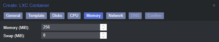 At the memory tab, we select the ammount of RAM assigned to this LXC, in this case, with 256MB should be ok (even 128MB). Also, I usually remove swap memory: