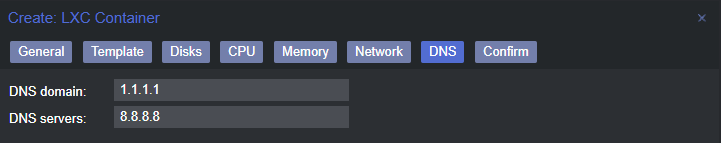 DNS tab allow us to specify which DNS will our LXC use. By default it passes Proxmox's host ones, but it won't work for me, because those DNS are some selfhosted ones, on other VLAN, so they won't be accesible for this LXC. I will use Cloudflare and Google: