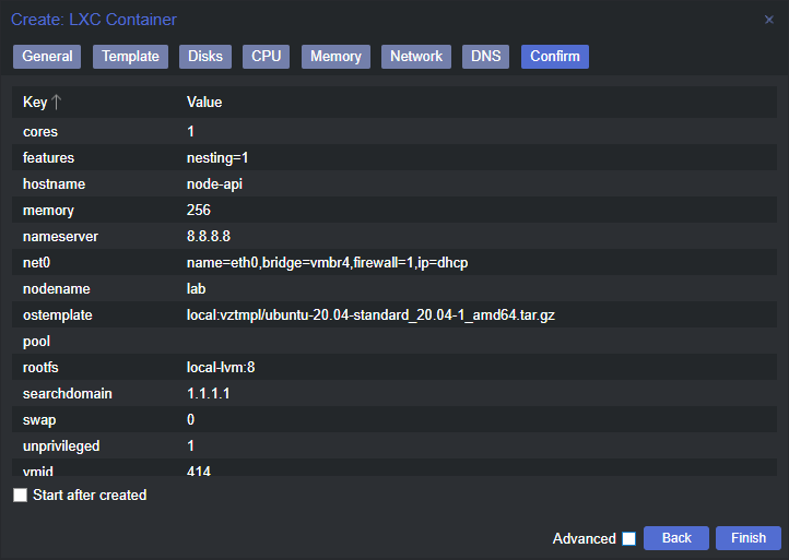 When clicking on finish, we should wait a bit to let Proxmox finish the LXC creation, and close the window. With it done, just select the new LXC, and start it.