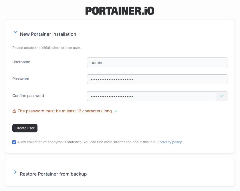 And vistit your new interface at https://<your_server_ip>:30779. It should ask you for a username and password for the administrator account. Once you filled it up, click on Create user.
