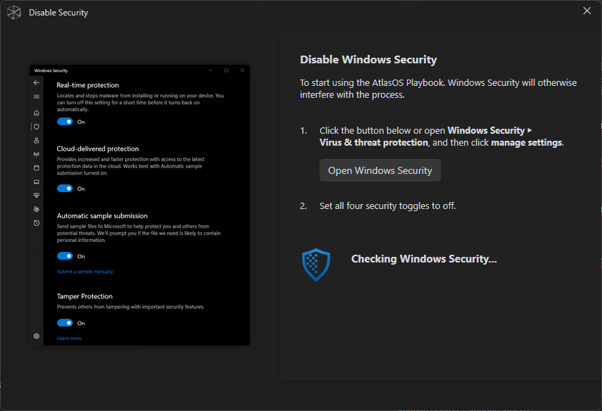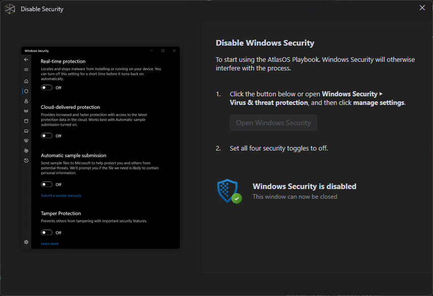 Here comes the delicate part, disabling Windows Security. This is common between this type of tools, since they alter Windows configurations and registers, and the firewall does not allow this. I understand that this could sound dangerous, so, if you want to be sure, this tool is open sourced, you can check its github.
