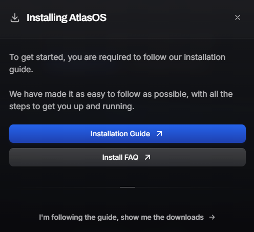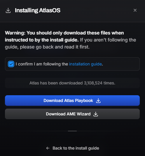 Now select I confirm I am following the installation guide as the image shows, and proceed to download both Atlas Playbook and AME Wizard.