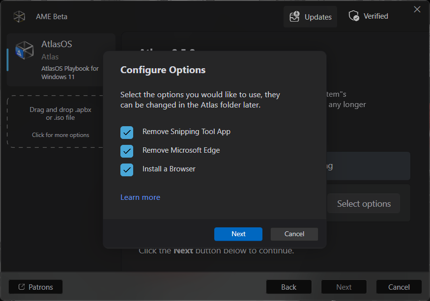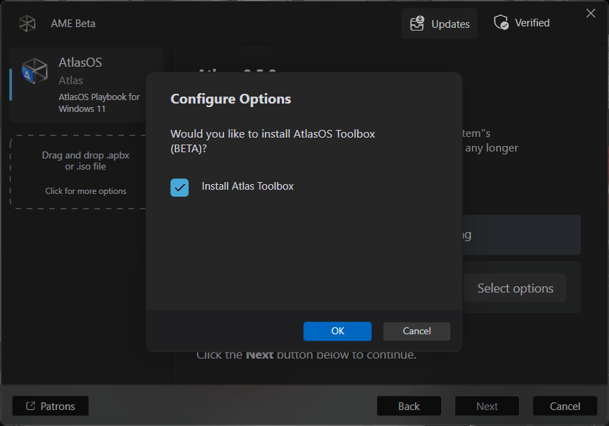 As the last option, I recommend to let it checked as it came. It will install us an executable with all the options and tweaks Atlas is able to make, letting us modify or revert some configurations to change the system as we like, with a pretty useful interface. If not, you must deal with some scripts.