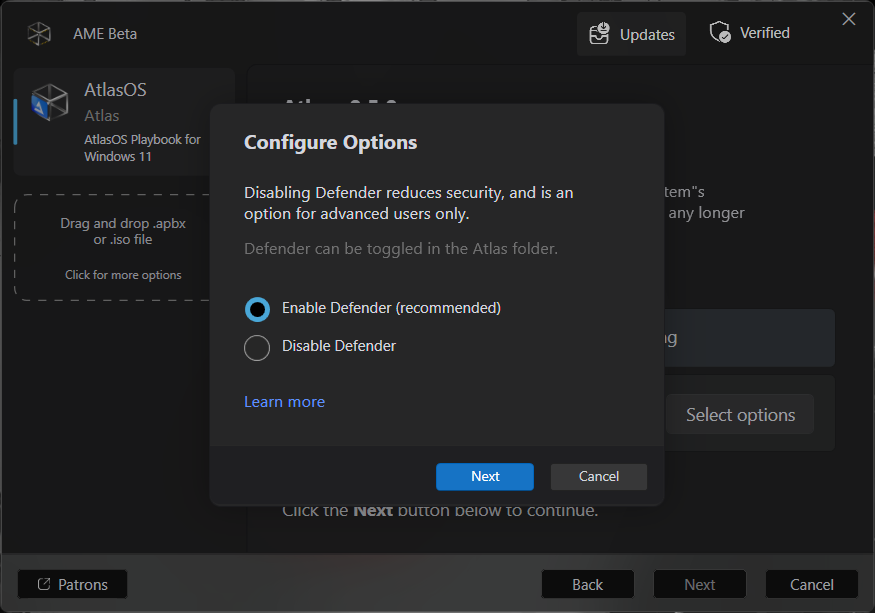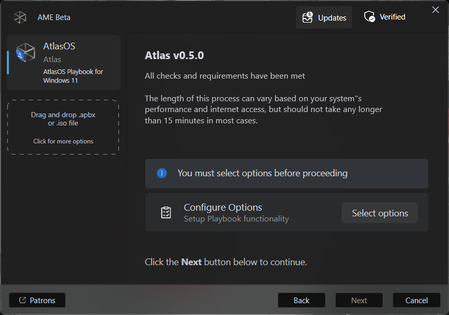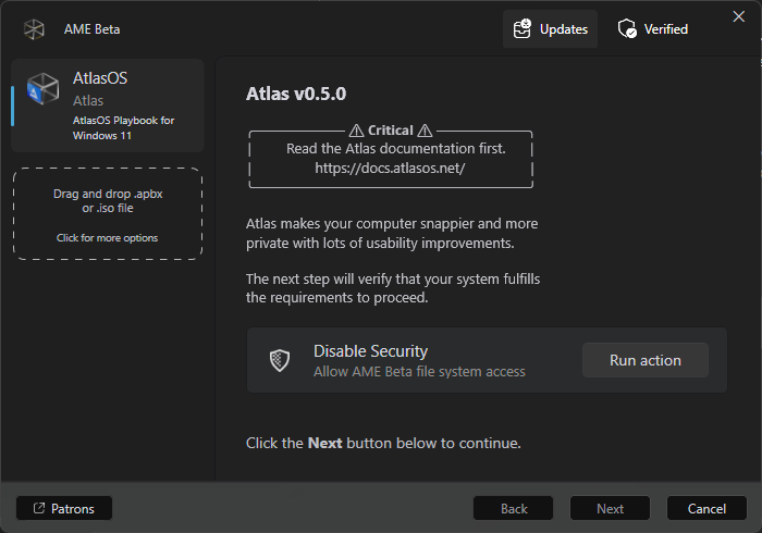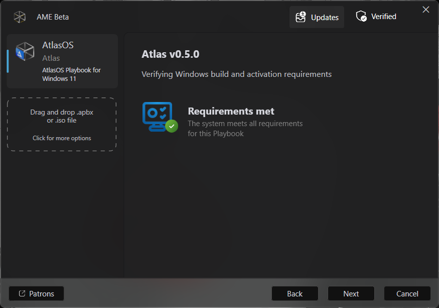 In this step could appear a warning showing us that the requirements are not met, and a button to apply changes and restart. Do it so and when the system reboots, AME will relaunch, proceed as we did, maybe you will have to re disable Windows Security, but once done, the requirements will be met.