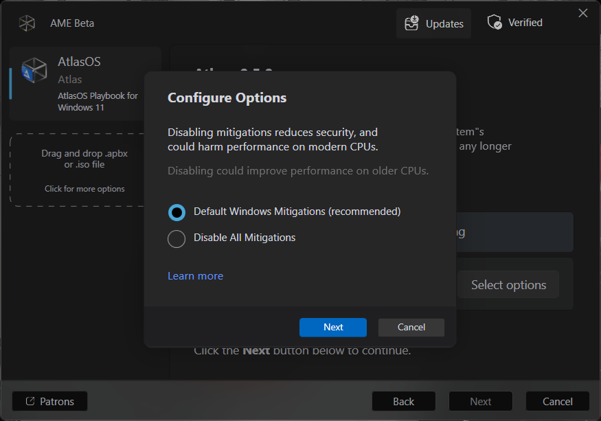 By clicking on Next, we can opt disabling mitigations. Again, the recommended one, letting Default Windows Mitigations, is fine for most cases. If you have an older CPU and have doubts, click on Learn more. Once selected, click Next.