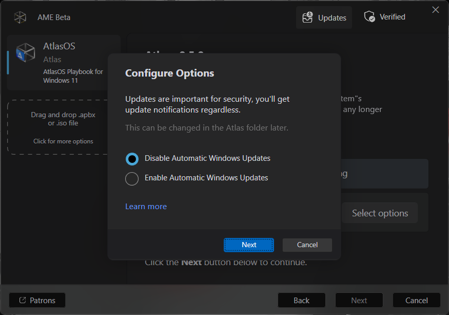 Now one that most of you wanted: Windows Updates. We can choose between enabling (the default Windows 11 behavior) or disabling them. When disabled, we will still get notifications when a new update is released, but we will have to manually install it using Windows Update. This is the recommended option and the one I followed. Click on Next.