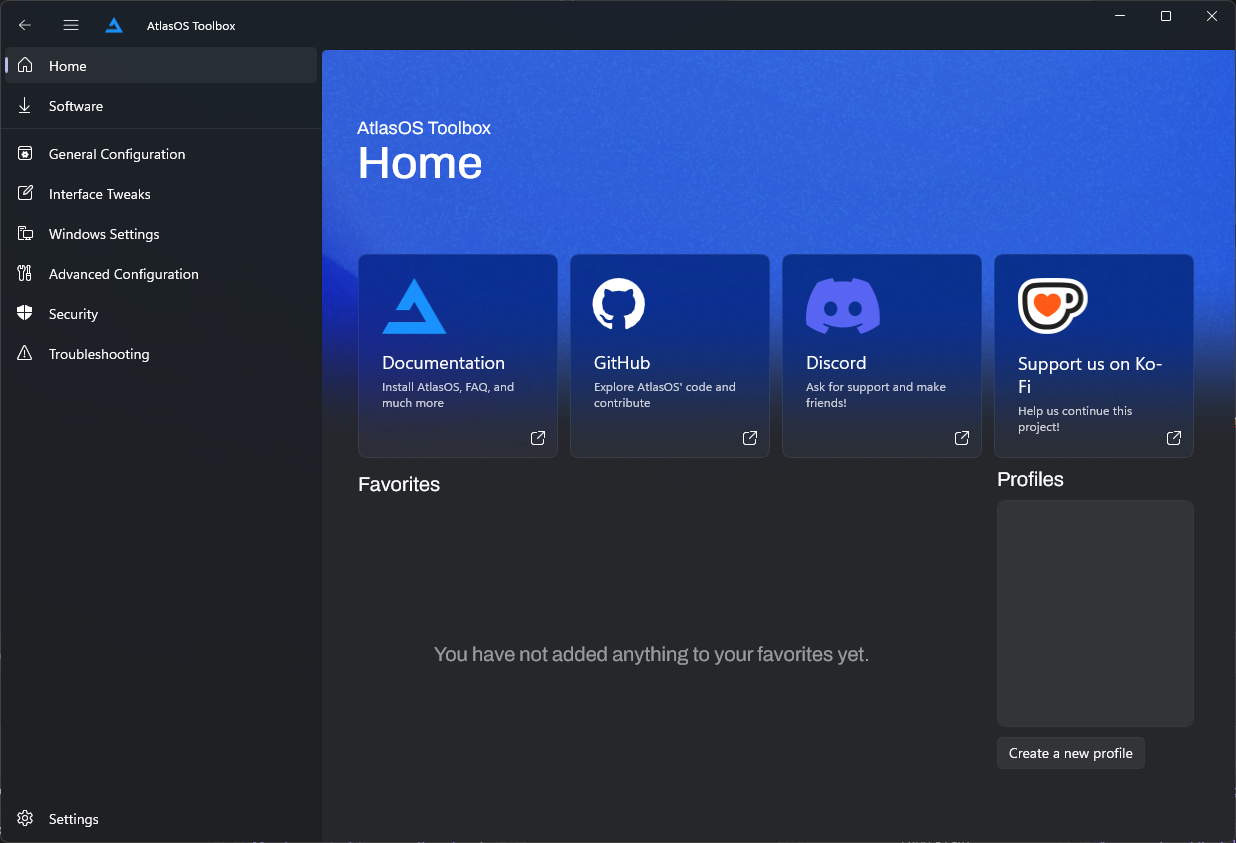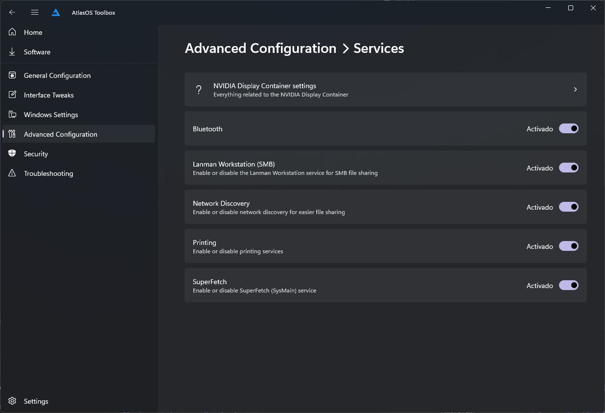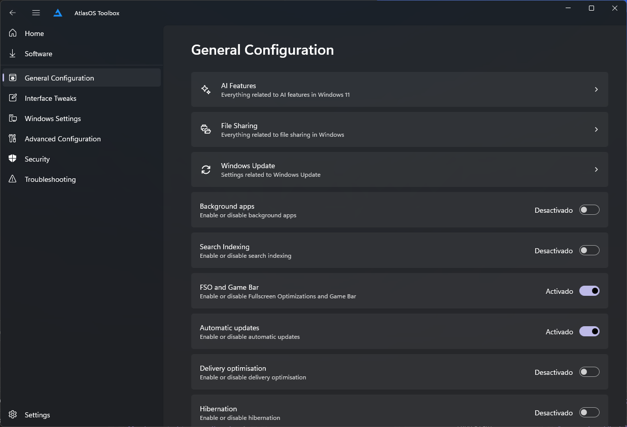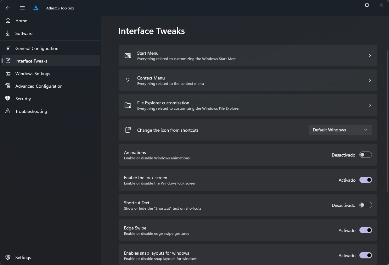 It's a pretty handy user interface that let us configure even more the things that Atlas changes on our system. I will not cover all, but show some of them. The tool is as follows.