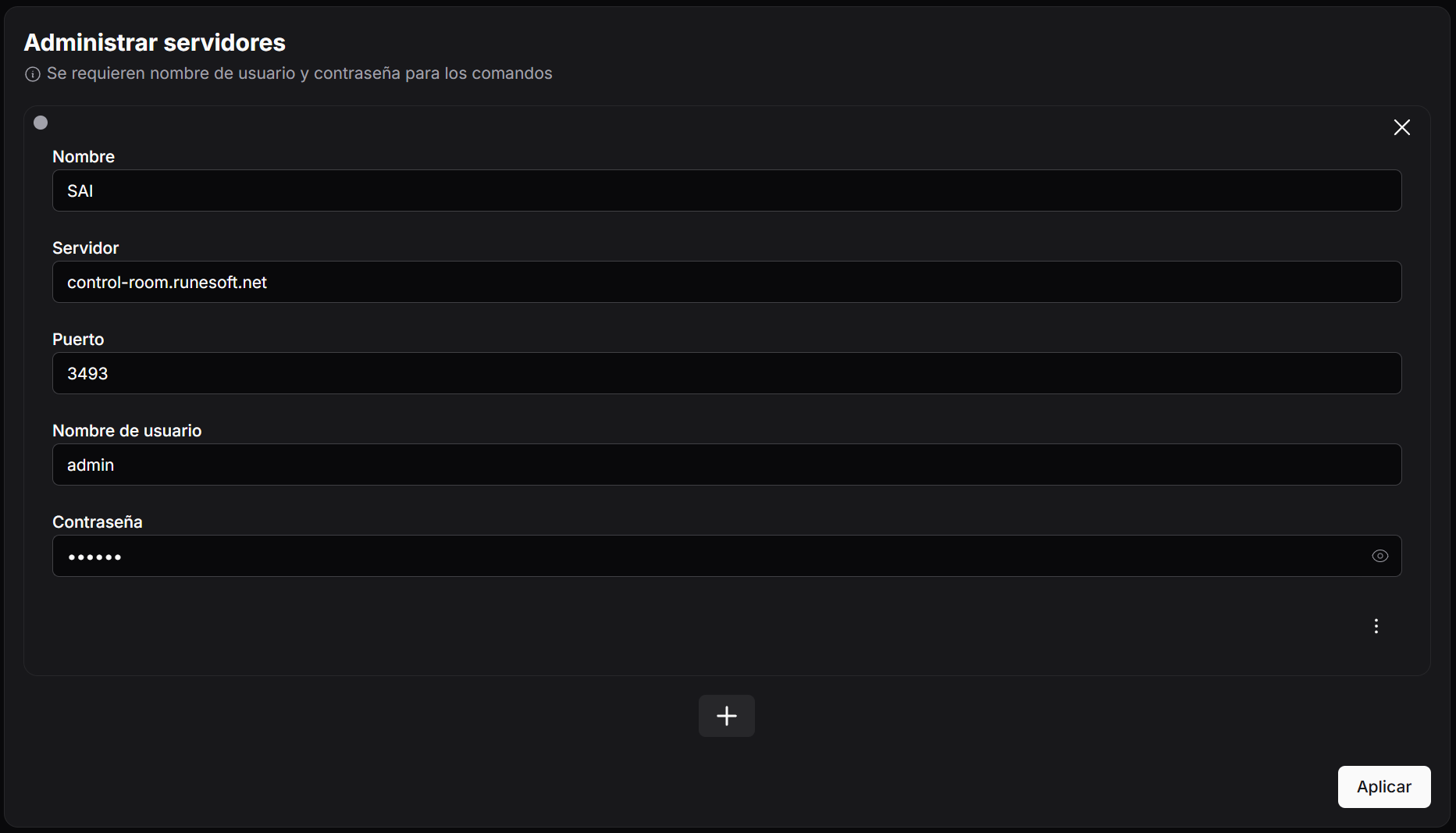 Donde dándole al icono del + nos aparecerá el formulario para dar de alta un UPS. Recuerda modificar los campos con los valores que hayas ido configurando, como el puerto, el servidor, o el nombre y contraseña del usuario: